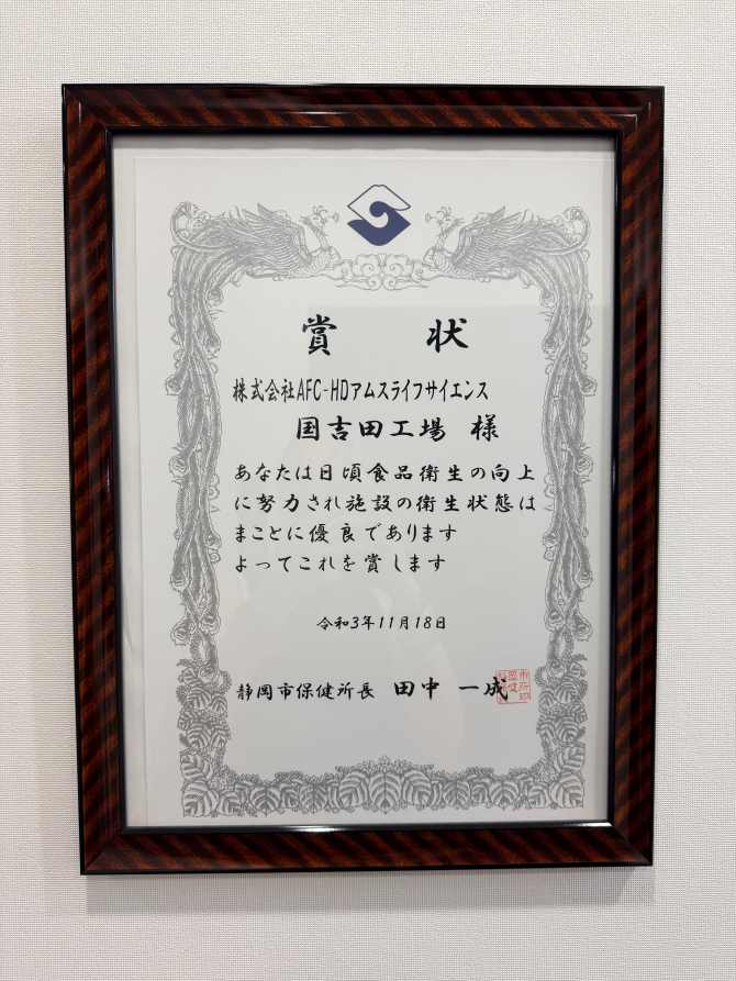 「AFC工廠的潔淨程度已超越保健所製定標準,獲得當局額外正式表揚」