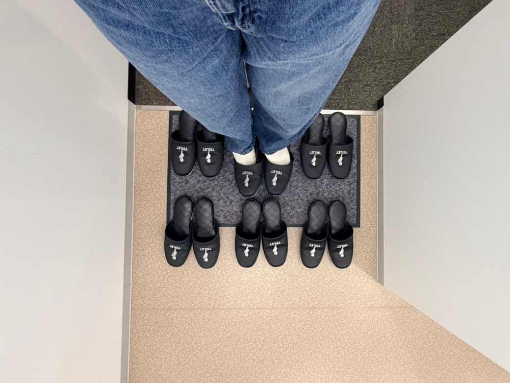 進入工廠必須先換上室內拖鞋,入口也有手部清潔區,