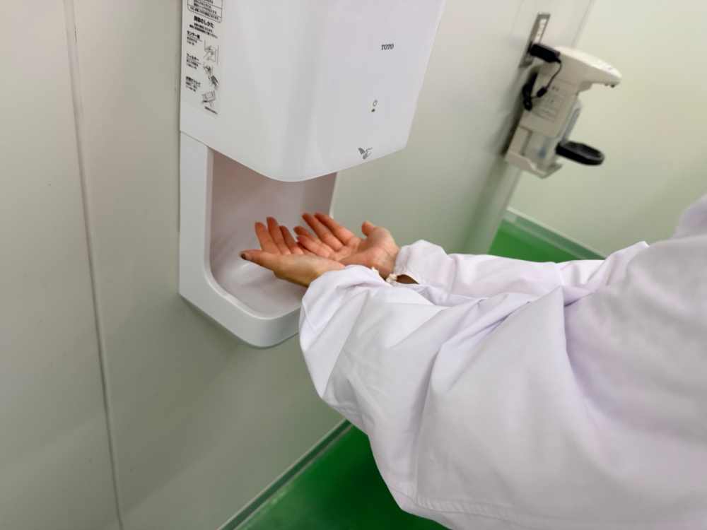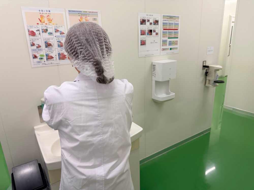 在要求高度潔淨的AFC工廠中,連洗手時間都有規範,洗手台右上方則是計時器,
