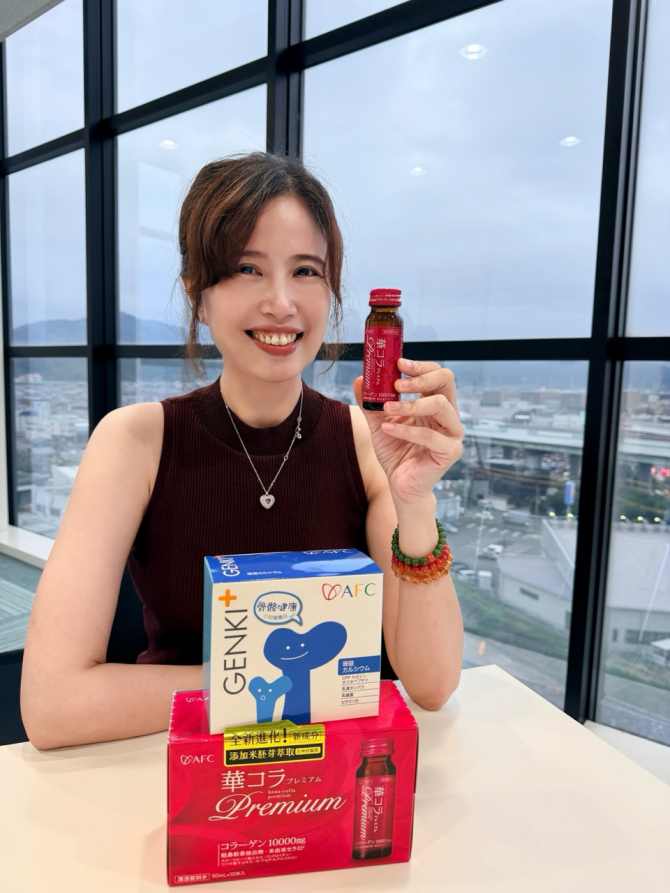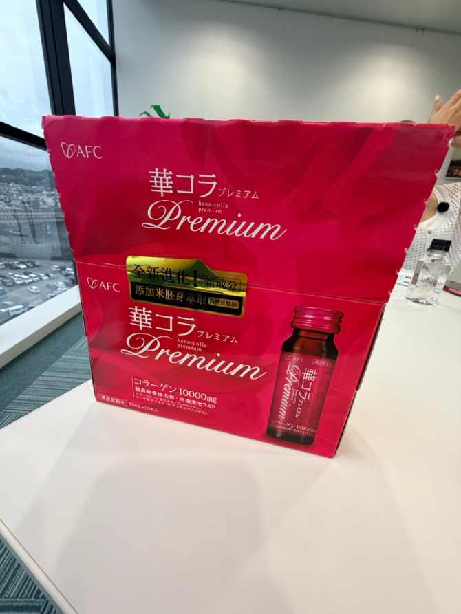 這次去參訪日本AFC總部工廠時,還試飲了華舞.膠原蛋白飲,超好喝。